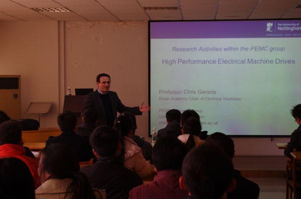 Chris Gerada 教授下午在智能楼四楼报告厅做了题为“High Performance Electrical Machine Drives”的学术报告。报告会由副院长刘闯教授主持,电气系老师和研究生积极参加了报告会。Prof. Chris详细介绍了诺丁汉大学电机与电力电子研究组在航空电源方面的研究方向及研究成果。特别从航空应用高功率密度、高效率和高可靠性以及容错要求等方面介绍了航空电机及变换器设计的诸多新概念和方法。报告最后参会的老师和研究生对Chris Gerada教授课题组在航空电机及控制方面做出的创新成果非常感兴趣,提问踊跃,Chris Gerada教授逐一进行了认真细致的回答。广大师生受益匪浅,报告在热烈的掌声中结束。