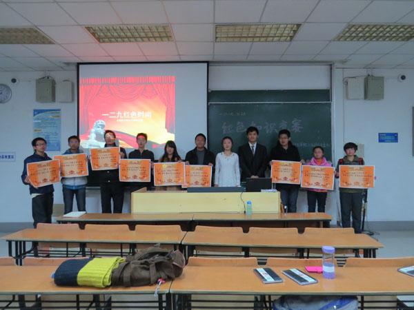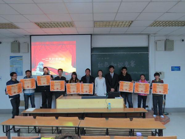 由AWC万象城娱乐2013级团总支主办的“一二・九”红色知识竞赛于11月29日在将军路校区6101教室顺利举行。本次活动旨在通过知识竞赛的形式增强同学们对的红色革命知识的了解,更好地激发同学们学习红色历史知识的热情,号召大家不忘历史,学习过去,不断进步。