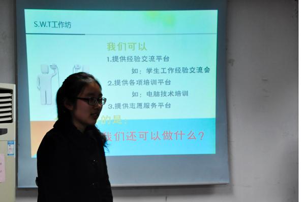 12月9日,万象城第十二期S.W.T.工作坊在将军路校区学生事务服务中心楼上301会议室举行。院团委、学生会、科学与技术协会、青年志愿者协会的代表及各年级中心组组长等参与了活动。