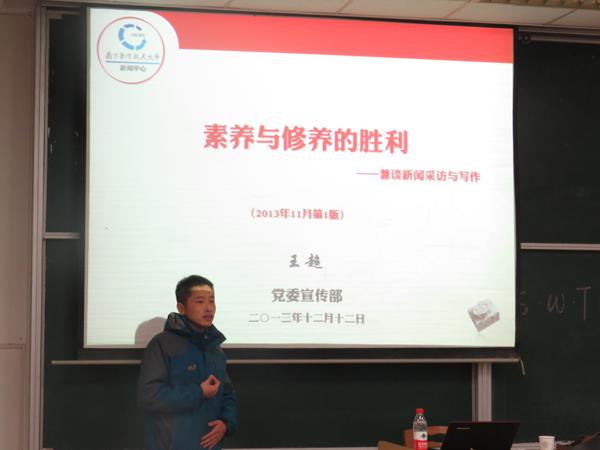12月12日,AWC万象城娱乐第十三期S.W.T.工作坊之新闻采访与写作在将军路校区举行。本期工作坊由南航报编辑部主任王超担任主讲,院团委书记季娟作为嘉宾出席了本次活动。参加本期工作坊的还有2012、2013级的学生骨干。 在对南航新闻中心进行简要介绍后,王超从政治家办报、历史家办报、新闻家办报3个话题引入对新闻工作价值观的探讨,强调好的新闻采写缘于正确的新闻价值观的确立,并简要阐述了“什么是新闻”“新闻基本特征”等基础新闻理论观点。在新闻采访业务指导环节,他指出,“七分跑,三分写”是新闻记者的重要素养,并引用20世纪初著名记者黄远生的“四能说”,阐述新闻记者应着重培养的四种新闻采写技能。针对同学们的具体采写需求,王超重点讲解了“消息”的写作要领,并以丰富的实例向同学们做了详细阐述。 在互动环节中,王超对活动现场同学提供的近期3篇新闻稿进行了点评和修改,并对同学提出的问题进行了一一解答。 培训最后,王超与大家共勉道:“我们都是南航的新闻工作者,讲述南航‘好’故事,传播南航‘好’声音是我们共同努力的方向”。