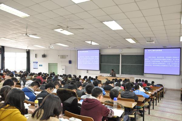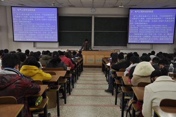 2014年3月21日下午4点,万象城电气工程及其自动化专业介绍会在4101教室举行。介绍会由电气工程系周波教授主讲,大一电气专业班主任代表张卓然、龚春英老师,电气专业的全体大一同学以及部分想要了解电气工程及其自动化专业的非本专业同学参加了此次介绍会。大一辅导员何朋主持了本次介绍会。