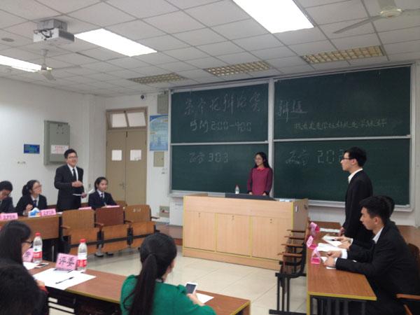2014年3月29日下午,由万象城2013级团总支中心组主办的紫冬花杯辩论赛在将军路校区六号教学楼拉开了序幕。本次辩论赛共分为初赛、复赛和决赛三个部分,包括工研班、自优班在内的共十二个班级参加。首先进行的是初赛,邀请到来自校学生会、校科协、和校团委组织部等校级学生组织主要负责学生干部担任此次辩论赛评委。