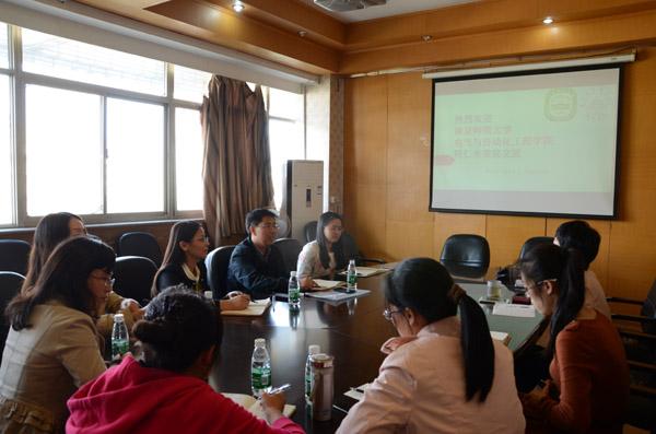 蒋乃文介绍了南师大电自院的整体情况,并就辅导员队伍建设、学生党建和学风建设等学生工作中的重点难点问题进行了交流探讨。随行的南师大电自院的学工办主任、团委书记和辅导员就学生评优评奖、团学工作、党校工作等具体工作的开展,与万象城进行了深入细致的沟通。