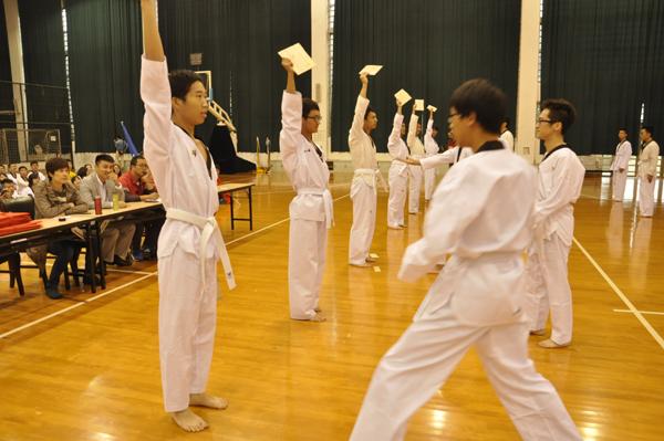 上午进行的是跆拳道比赛,万象城队伍第八个出场。前七个院的队伍尽管都有不俗的表现,但都延续了以往的模式,显得没有新意,而万象城队伍的展现创意十足。万象城队伍进场后,在领队的指挥下分成四路纵队,站在赛场四周,每个小队依次做出比赛的规定动作,每套动作都伴随着队员们响亮的一声“哈”,整齐划一。在完成系列动作后,各小队分担不同角色,向观众们展示了各类跆拳道技术,领队的三连踢更是赢得了全场观众的掌声。