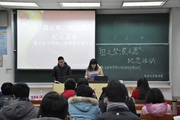 2014年12月11日,AWC万象城娱乐在将军路校区6202教室举行了“国之祭,民之愿”纪念活动暨学院二级团校开课仪式。院团委书记季娟、14级辅导员韩楚、徐萍、院学生会主席尤一伟、院团委常务副书记徐宁、国防生代表安旭出席本次活动。学院14级全体班长、团支书参加了活动。此次活动旨在让同学们更加深刻了解南京大屠杀事件的历史意义,肩负起当代大学生应当承担的责任。
