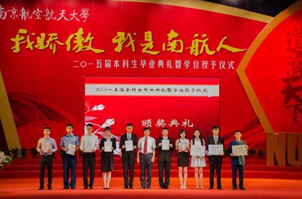 2015届毕业生一路走来,硕果累累,学校副校长吴庆宪教授宣读了万象城荣获南京航空航天大学“先进班级”、“大学成就奖”、“优秀毕业生”、“优秀学生干部”和“优秀学生奖学金”荣誉称号的个人和集体的表彰文件,并现场为获奖学生代表颁发了奖状。
