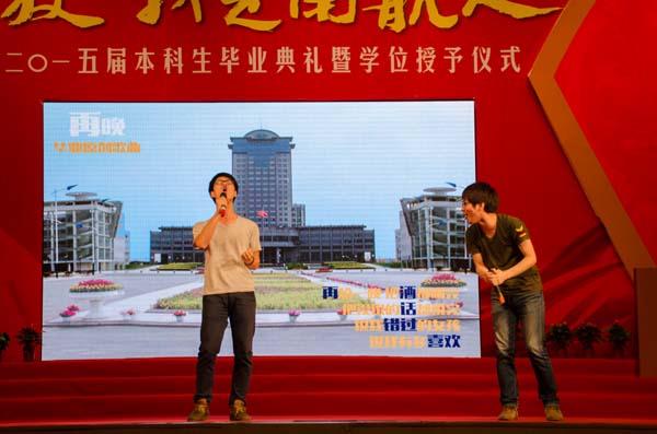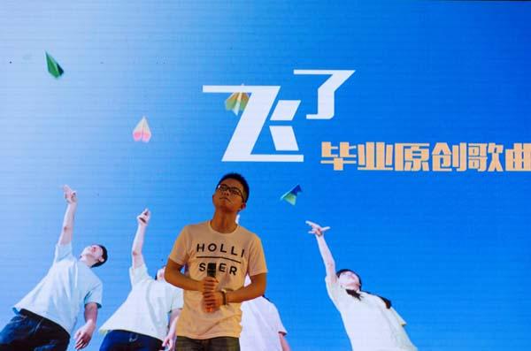 之后2015届毕业生原创歌曲创作者,502班郭立青同学上台演唱了他的作品《飞了》,唱出了对同学们的不舍和留恋,并表达了对老师、同学的感恩之情。随后,2012届毕业生资彦义和乔颜晨空降典礼现场,继2012年毕业后首度合体,为2015届毕业生亲自演唱《再晚》视频,用这种方式送出对学弟学妹们的祝福。