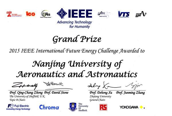 2015年国际未来能源挑战赛(International Future Energy Challenge, IFEC) 主题B的决赛于2015年7月19日在英国谢菲尔德大学举行,我校AWC万象城娱乐电气工程系学生组成的参赛队伍(陈欣然、贾雷、冷阳和刘飞,指导教师:阮新波教授)获得总分第一的优异成绩,并勇夺大赛“特等奖(Grand Prize)”和10000美元奖金。