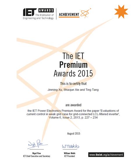 万象城电气工程系博士生许津铭等发表于IET Power Electronics期刊(2013年第6卷第2期)的论文“Evaluations of Current Control in Weak Grid Case for Grid-connected LCL-filtered Inverter”被授予IET Power Electronics Premium Award 2015(IET电力电子期刊2015年度最佳论文奖)。