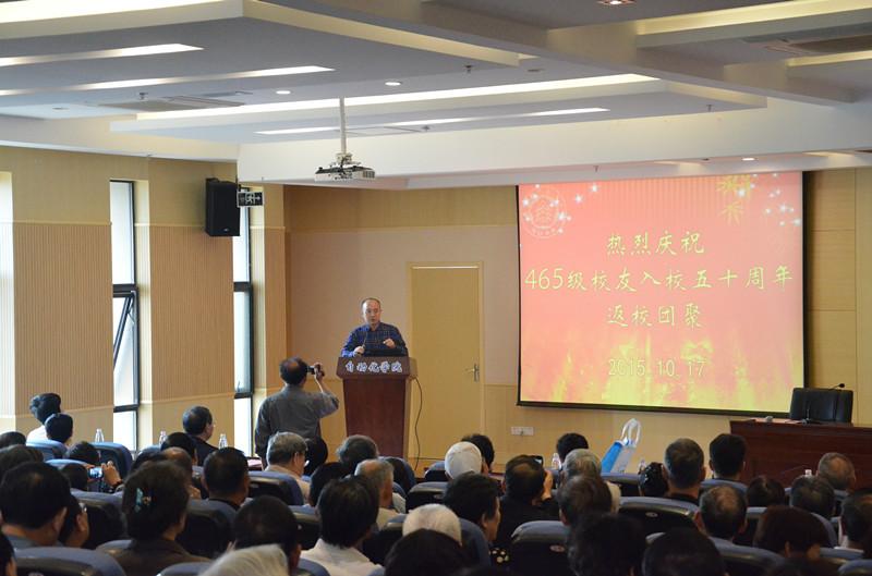 返校聚会活动中,院党委书记刘建成首先致欢迎辞,他向465级老校友们重回母校相聚表示热烈地欢迎,对各位老校友在古稀之年仍能惦念着母校表示感动,广大校友是学院最具生命力的财富,学校和学院每一步发展都离不开校友的关心和支持,希望各位校友常回家看看,给学校的工作和发展提出批评、建议,共同促进学校和学院各项事业的健康蓬勃发展。副院长赖际舟介绍了学校发展现状和发展目标,重点介绍了学院情况,包括学院搬迁到新校区的建设情况,学院近几年发展历程、师资队伍建设、学科建设、科学研究、学生培养等,同时感谢各位老校友为学院做出的杰出贡献。最后,校友代表郁德昌发言,他表达了校友们对母校的眷恋与热爱,并对学院近年来的快速发展和取得的成绩感到骄傲和自豪,校友们将会继续关注母校发展,为母校明天更加美好做出自己的一份贡献!
