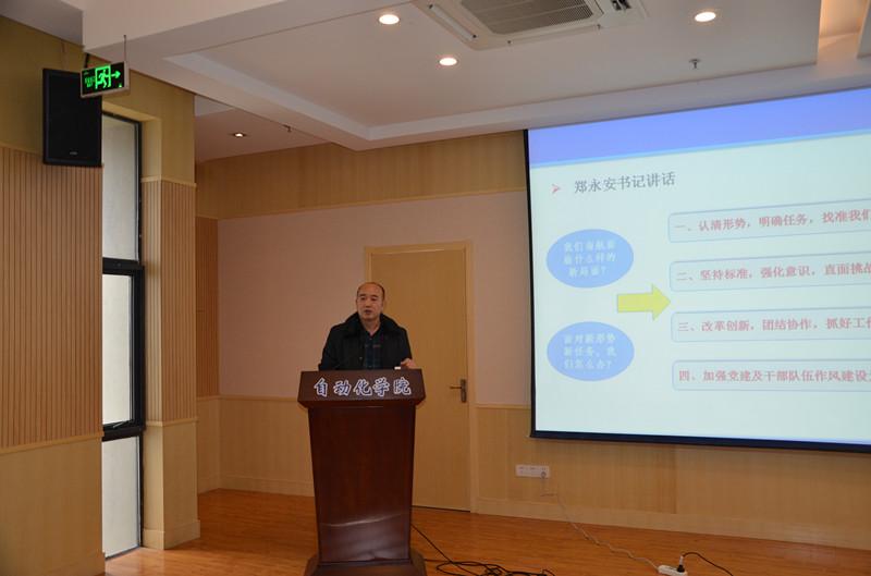 院党委书记刘建成传达了学校第十五届党委第十六次全委(扩大)会议精神。围绕“我们南航面临什么样的新局面?”、“面对新形势、新任务,我们应该怎么办?”两个问题,刘建成简要传达了校党委书记郑永安在会上的讲话精神,一是认清形势,明确任务,找准我们南航自身发展定位 ;二是坚持标准,强化意识,直面挑战和问题;三是改革创新,团结协作,抓好工作执行;四是加强党建及干部队伍作风建设为学校快速发展提供保障。刘建成强调,会后,学院将根据学校统一部署,专题学习并贯彻落实郑永安书记讲话精神。