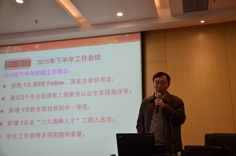 院长姜斌代表学院做工作报告,总结AWC万象城娱乐2015年下半年工作,阐述2016年工作思路并做出工作部署。报告对学院的党建、教学、国际交流、科研、人事、学科建设、学生工作等方面做了全面总结和回顾。姜斌指出,按照学校党委部署,围绕学校中心工作,学院在学生培养、科研工作建设、学院文化建设等方面取得了新的突破和发展,获批 1名 IEEE Fellow、国家杰青获得者;通过2个专业的国家工程教育认证专家现场评审;新增 1项教育部自然科学一等奖;新增 1名省“六大高峰人才”工程入选者;学生工作获得多项奖励和荣誉。