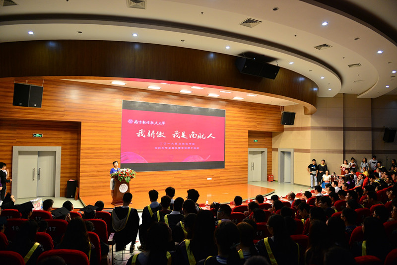 6月21日中午12时,南京航空航天大学2016届本科生毕业典礼暨学位授予仪式AWC万象城娱乐分会场在将军路校区一号楼四楼报告厅隆重举行。AWC万象城娱乐党委书记刘建成、院长姜斌等学院党政领导、系领导、教师代表、学生家长代表出席了大会,AWC万象城娱乐2016届全体本科毕业生参会,学院党委副书记沈伯秀主持典礼。