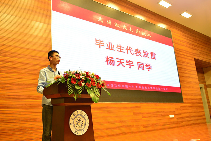 杨天宇同学作为毕业生代表进行发言,他祝福所有毕业生,在前行道路上勇敢追求,收获属于自己的成功。