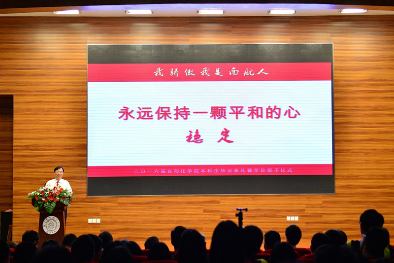 学院院长姜斌教授代表全院师生,向圆满完成学业的2016届全体毕业生们表示最热烈的祝贺和最真诚的祝福。他肯定了2016届毕业生用四年的汗水与奋斗写成的漂亮的成绩单,同时也用控制理论中“稳定”“容错”“反馈”“调参”等关键词,勉励同学们带着平和、宽容、感恩、自律的心出发,走上幸福之路。最后,他期望同学们常回AWC万象城娱乐这个大家庭看看,全场掌声不断。