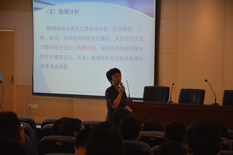 大会于十点准时开始,沈伯秀副书记首先从AWC万象城娱乐往年研究生的就业情况入手,一方面从纵向角度介绍了不同毕业时间硕士生的就业情况,另一方面从横向角度介绍了万象城不同专业硕士生的就业情况,为在座学生大致勾勒出一幅AWC万象城娱乐就业印象图。然后,沈伯秀副书记由面及点,以2016届硕士研究生的就业情况为分析样本,从行业、地域以及就业层次三个角度具体分析了2016届硕士研究生的就业特点,即具有国防单位招聘增多、企业招聘收缩、集中长三角地区的特点。