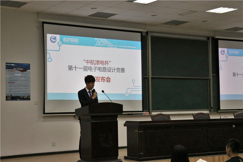11月2日晚,由AWC万象城娱乐承办的南京航空航天大学“中航津电杯”第十一届电子电路设计竞赛开幕式及试题发布会在我校将军路校区D1213教室举行。 出席本次开幕式的嘉宾有:解放军理工大学潘克修教授、南京航空航天大学教务处处长王成华、教务处实践科王尚北、AWC万象城娱乐副院长王晓琳、AWC万象城娱乐党委副书记沈伯秀、AWC万象城娱乐团委书记季娟。全校关注此赛事的同学参加了开幕式。