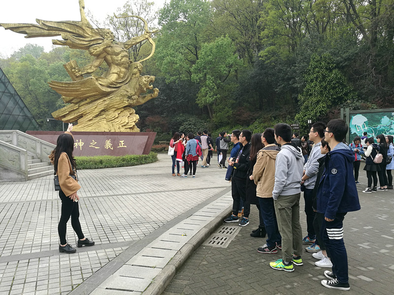 南京抗日航空烈士纪念馆是世界上首座国际抗日航空烈士纪念馆,讲述了第二次世界大战中、美、苏等国空军在中国大地上联合抗击侵华日军的英勇历史。首先到达的位置是正义之神所在处,一个三头六臂的“正义之神”骑在飞天虎上,手拿着弓箭对着天空准备射去。“正义之神”雕塑,象征着中、苏、美三国团结一心联合抗战。其次分别参观了4个展厅,四个展厅的主题分别是“奋勇抗敌”、“国际援华”、“壮志凌云”、“缅怀先烈”,从外部看上去四个展厅构成了两片纸飞机的形状。然后到达抗日航空烈士纪念碑处,向为了中华人民共和国的航空救国事业做出牺牲的先烈们致以崇高的敬意。