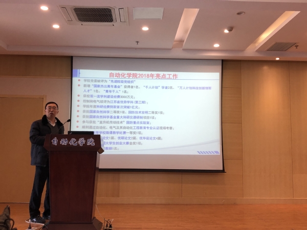院长姜斌同志代表学院做工作报告,报告从党建、教学、科研、人事工作、学科建设和学术交流、学生工作、工会、安全工作等方面对学院2018年下半年的工作进行总结,对2019工作进行了全面部署。姜斌表示,2018年在全院师生的共同努力下,学院多方面取得了新的突破和发展,学院新增了国家杰出青年基金获得者1名、江苏省杰青1名;获批了国家自然科学二等奖1项、国防技术发明二等奖1项;新增了国家自然科学基金重大科研仪器研制项目1项;学院顺利通过了自动化、电气及其自动化工程教育专业认证现场考察;万象城教师在江苏省高等学校微课教学比赛中荣获一等奖1项、荣获江苏省最美高校教师1人。学生荣获江苏优博论文1篇、优硕论文2篇、优毕设论文4篇,并在“创青春”全国大学生创业大赛荣获金奖1项,荣获工信部创业奖学金特等奖一项,一等奖三项、创新奖学金一等奖二项。这些成绩的取得为学院下一阶段的快速发展奠定了良好的基础。他指出,2019年是完成“十三五”规划、决胜全面建成小康社会的关键年,是落实校第十六次党代会决策部署、推进双一流建设各项任务的攻坚年。学院要继续深化综合改革,逐步落实各项改革方案和举措,在“双一流”学科建设、高水平师资队伍的引培、重大重点科研项目争取、人才培养等方面工作不断加强,巩固和落实教育思想大讨论工作成果,进一步解放思想、提振精神、深化改革、抓实工作,高质量完成学院各项工作。