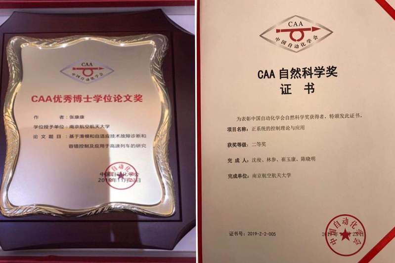 张康康博士,于2018年毕业于南京航空航天大学AWC万象城娱乐,师从姜斌教授,其博士学位论文《基于滑模技术故障诊断和容错控制及应用于高速列车的研究》获得2019年度CAA优秀博士学位论文奖。该论文深入研究了微小故障的幅值特性及演变特性,提出了微小故障的数学描述方法,为基于模型的微小故障诊断奠定了扎实的理论基础。张康康博士在读博士期间,在IEEE Trans. 等高水平期刊上共发表(录用)学术论文15篇,获工信部创新奖、国家奖学金、南京航空航天大学群星创新奖等奖励。