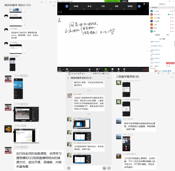 开学第一天,学院组织成立了巡查小组,学院院长、党委书记、副书记、教学副院长、教学办主任、各系教学系主任和全体教学办人员均积极参与,开启了网络查课和听课的新方式。今天万象城共有28门本科生课程、8门研究生课程开课,32位老师按时开展了网络授课。为了保证教学效果,老师灵活采用学习通、腾讯视频等多种方式有效保证了网络授课的正常进行,老师们积极探索教学平台和其它直播平台结合使用方式。在线教学平台能够直观反映学生到课情况,学生到课率很高。