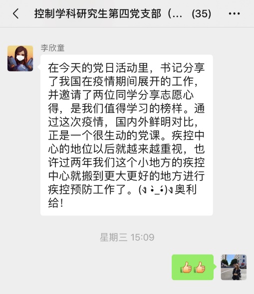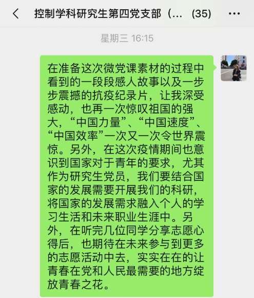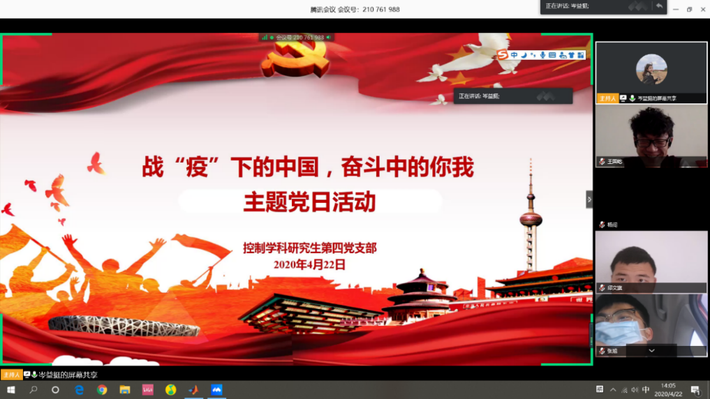 为贯彻中共中央《关于加强党的领导、为打赢疫情防控阻击战提供坚强政治保证的通知》和《新时代爱国主义教育实施纲要》精神,带动学生党员认真学习新冠肺炎疫情防控“大课”,发挥党员先锋模范作用,2020年4月22日下午,AWC万象城娱乐控制学科研究生第四党支部开展了一场以“战‘疫’下的中国,奋斗中的你我”为主题的线上党日活动,支部党员、发展对象、积极分子共计41人参加了本次活动。该党支部由学院教职工张玲老师担任支部书记,本次活动参与人员均为导航研究中心研究生。