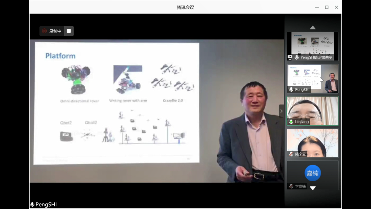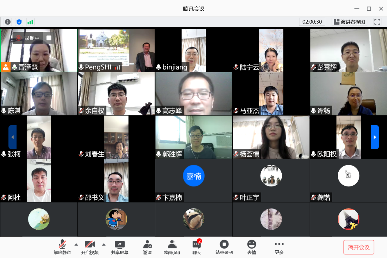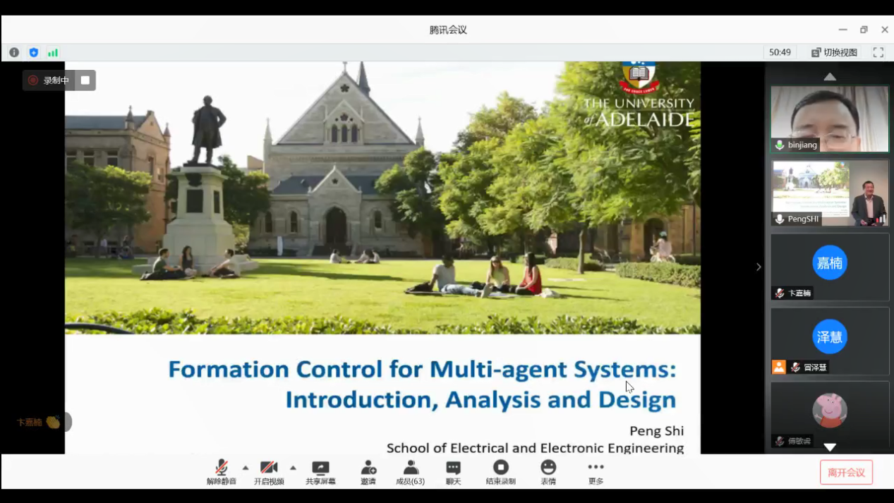812日下午,澳大利亚阿德莱德大学电气与电子工程学院石碰教授应我校国际合作处和AWC万象城娱乐的邀请,通过腾讯会议作了题为“Formation Control for Multi-agent Systems:Introduction,Analysis and Design的线上学术报告,报告由我校副校长姜斌教授主持。万象城副院长陈谋教授,学院陆宁云刘春生、冒泽慧、欧阳权张柯、马亚杰等师生在线参加会议。参会师生对石碰教授的交流分享表示热烈欢迎。