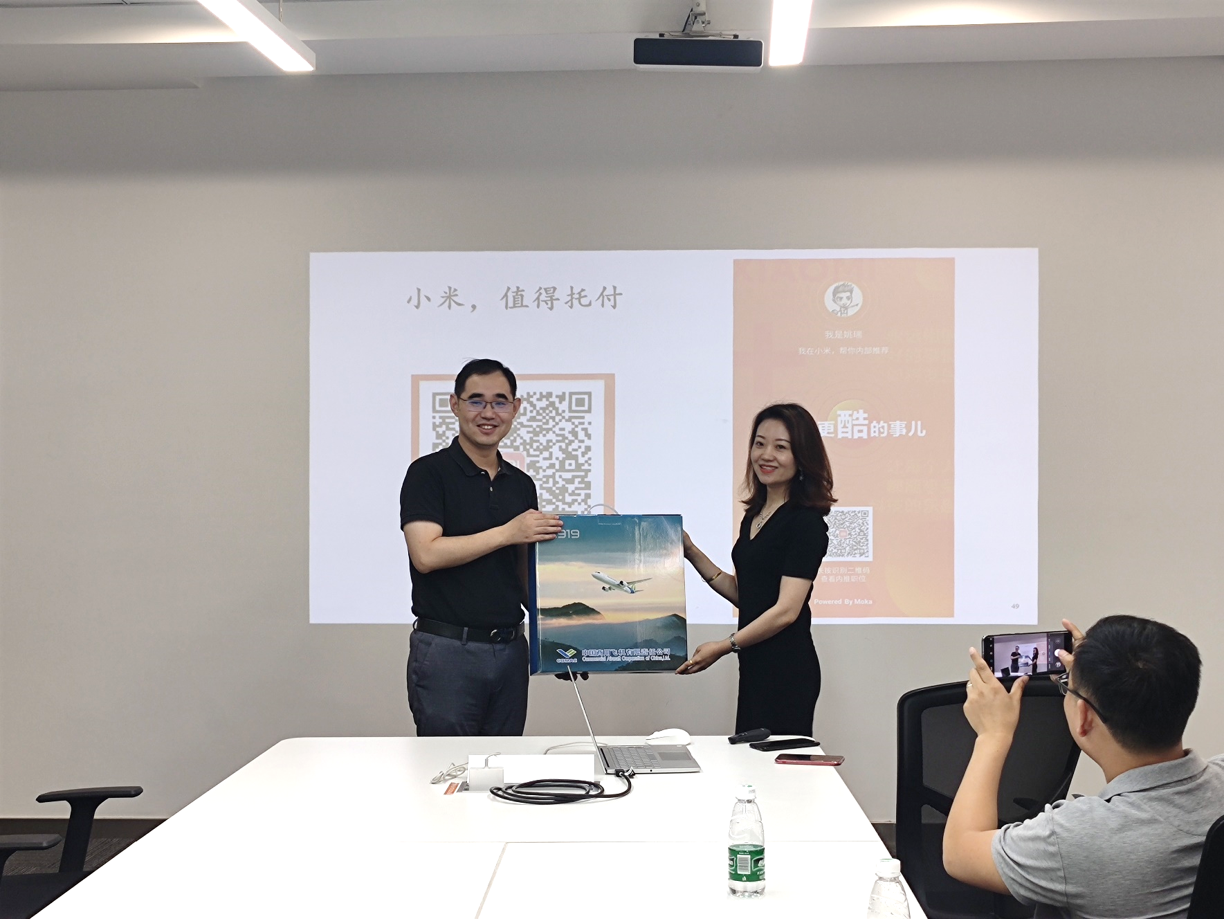 小米科技有限责任公司是一家专注于智能硬件和电子产品研发的全球化移动互联网企业。在人力资源总监张蕴等人的带领下,师生们首先参观了小米的员工办公区域包括运动设施,聊天沙发、免费饮料等。接着在会议室观看了小米公司的宣传片,人事总监张蕴介绍了小米集团的发展历程和价值观及其应届生培养计划,并欢迎南航毕业生来小米就职。最后,作为南航校友的王琪和姚瑞两位师兄,和同学们分享了他们入职以后的感受。人事总监也针对在座同学的求职疑问进行了一一解答。同学们听后都表示受益匪浅,对小米的企业文化有了更进一步的认识。活动结束之际,AWC万象城娱乐党委副书记张跃书记向南京小米赠送了由南航校友参与设计的国产大飞机C919模型一台,象征着南航AWC万象城娱乐与南京小米的友谊,也祝福南京小米蒸蒸日上。