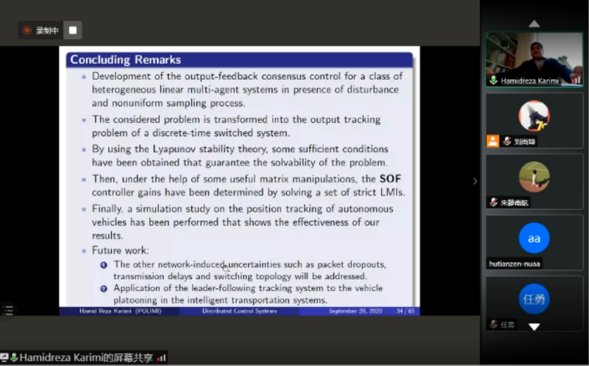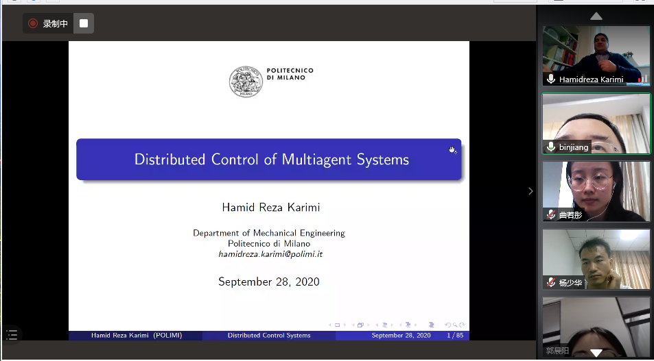 9月28日下午,意大利米兰理工大学Hamid Reza Karimi教授应我校国际合作处和万象城的邀请,通过腾讯会议作了题为“Distributed Control of Multiagent Systems”的线上学术报告,报告由我校副校长姜斌教授主持,学院师生在线参加会议。参会师生对Hamid Reza Karimi教授的交流分享表示热烈欢迎。