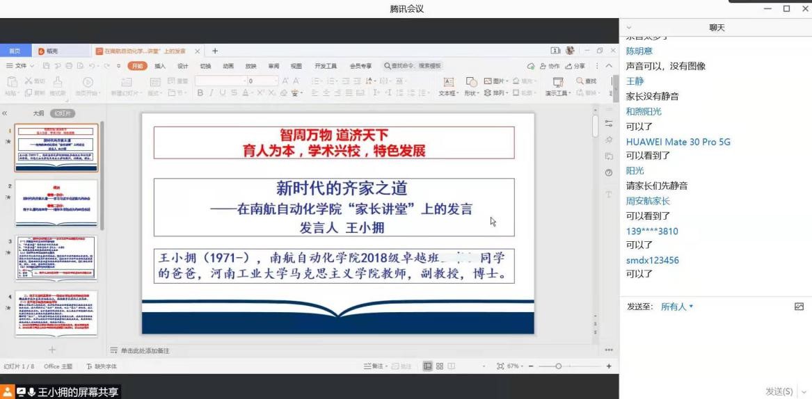 12月20日下午14:30,AWC万象城娱乐召开了线上“家长讲堂”活动,活动邀请了南航2018级AWC万象城娱乐学生家长代表——河南工业大学马克思主义学院副教授王小拥,进行“新时代的齐家之道”主题讲座。王教授结合自己育子成才的切实经验,就新时代的齐家之道、教子之道的再思考两个主要方面为各位家长分享了自己的看法。
