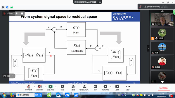 3月24日下午,德国University of Duisburg-Essen大学 Steven X. Ding 教授应我校国际合作处和万象城邀请,依托我校“民航运输安全”学科创新平台,作了题为“A unified framework of control and detection, and its application to fault detection and performance degradation recovery in feedback control systems”的学术报告。报告由我校副校长姜斌教授主持,学院师生在线参加会议。