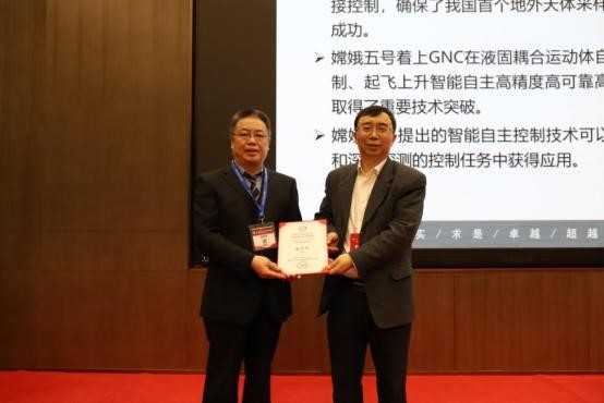 北京控制工程研究所副总师张洪华作《嫦娥五号着陆上升智能制导导航与控制》主旨报告,报告介绍了嫦娥五号着陆器上升器制导导航与控制系统组成、液固耦合运动体动力下降智能自主避障控制方法、月球表面智能起飞上升控制技术,描述了系统在轨飞行实施结果。
