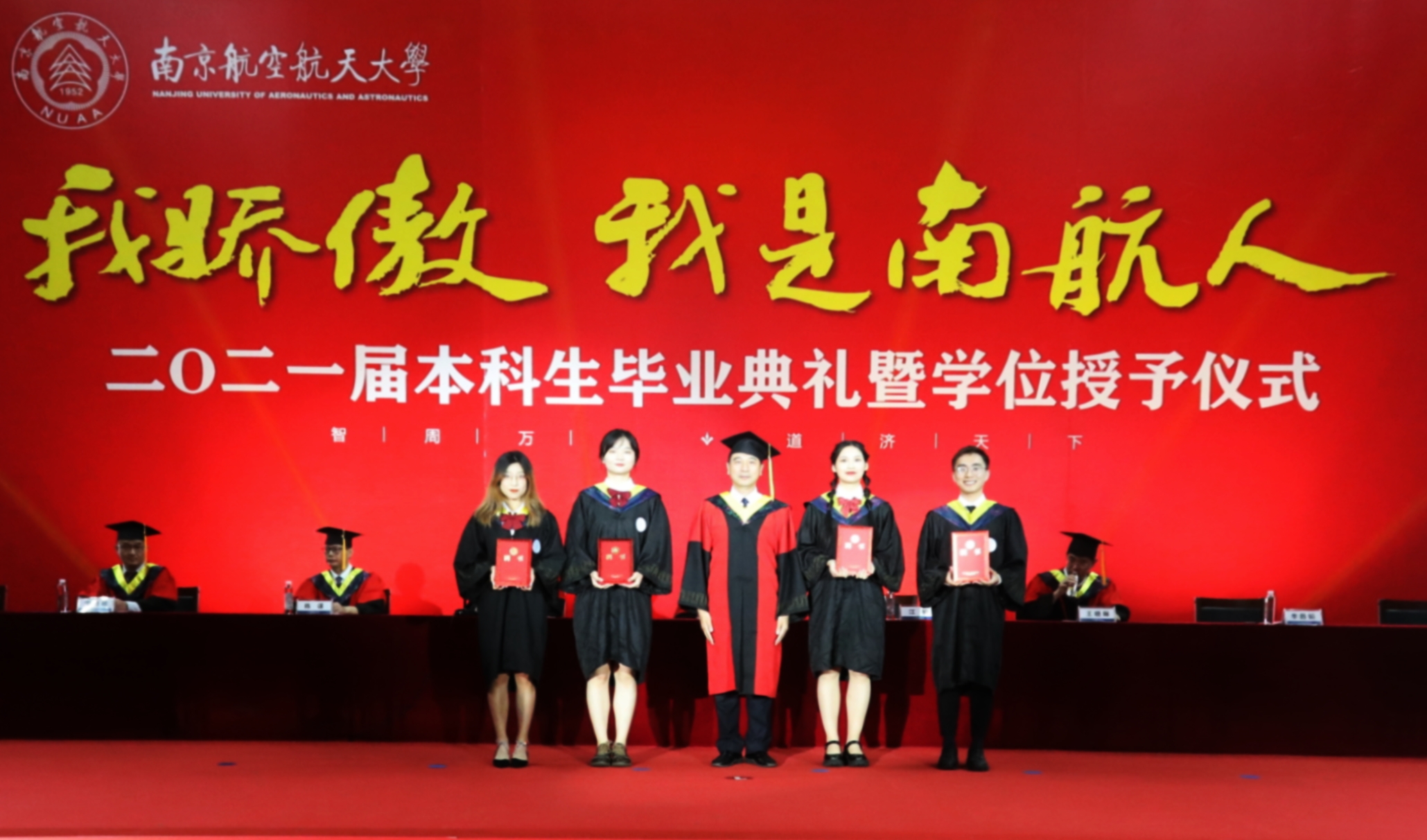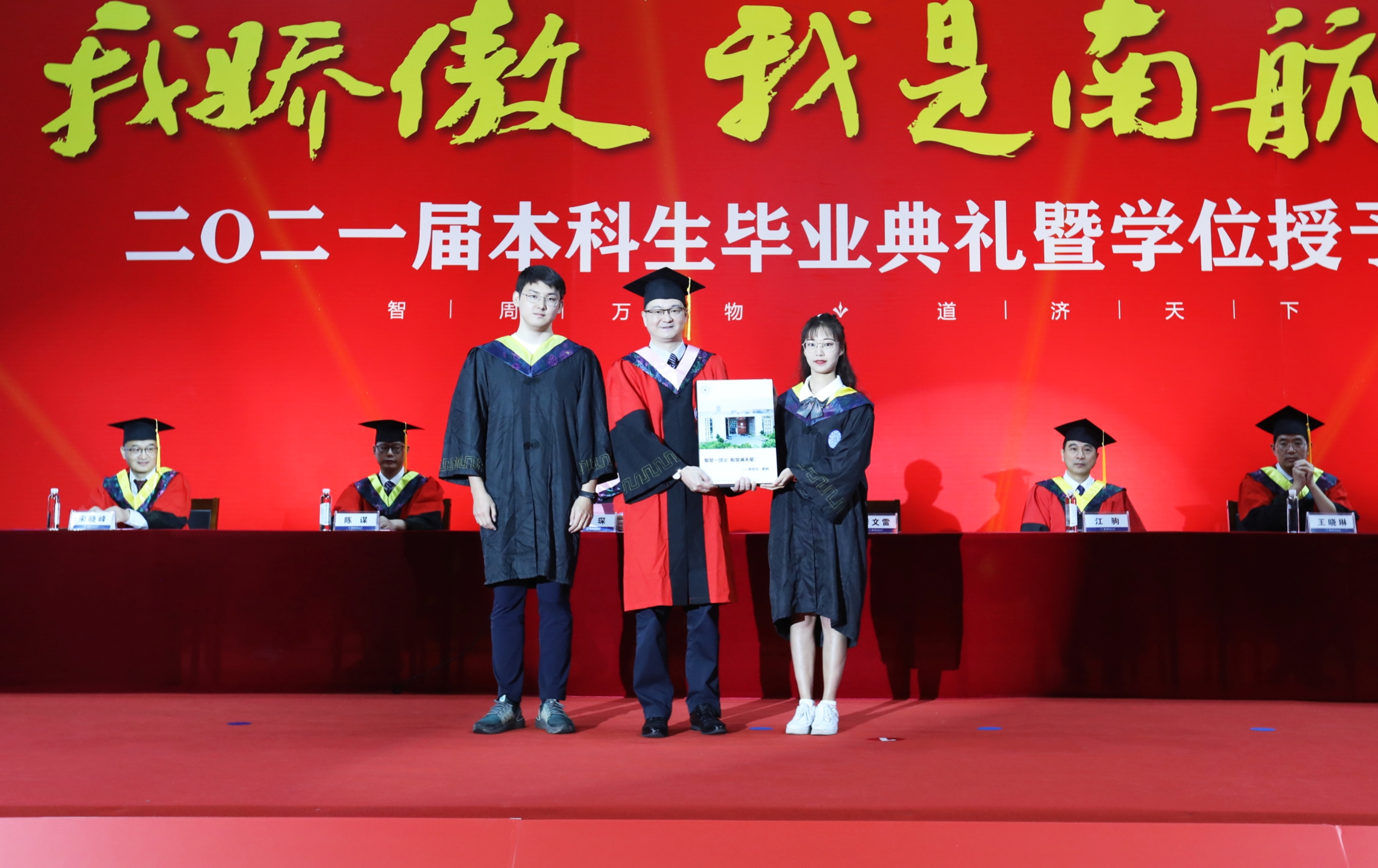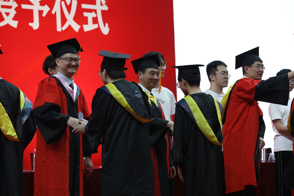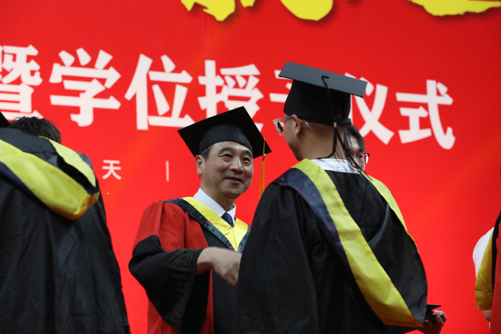 在学士学位授予仪式中,毕业生们身着学士服依次走上主席台,学院领导、院长助理和各系主任为学生拨穗、颁发学位证书,并拍照留念。