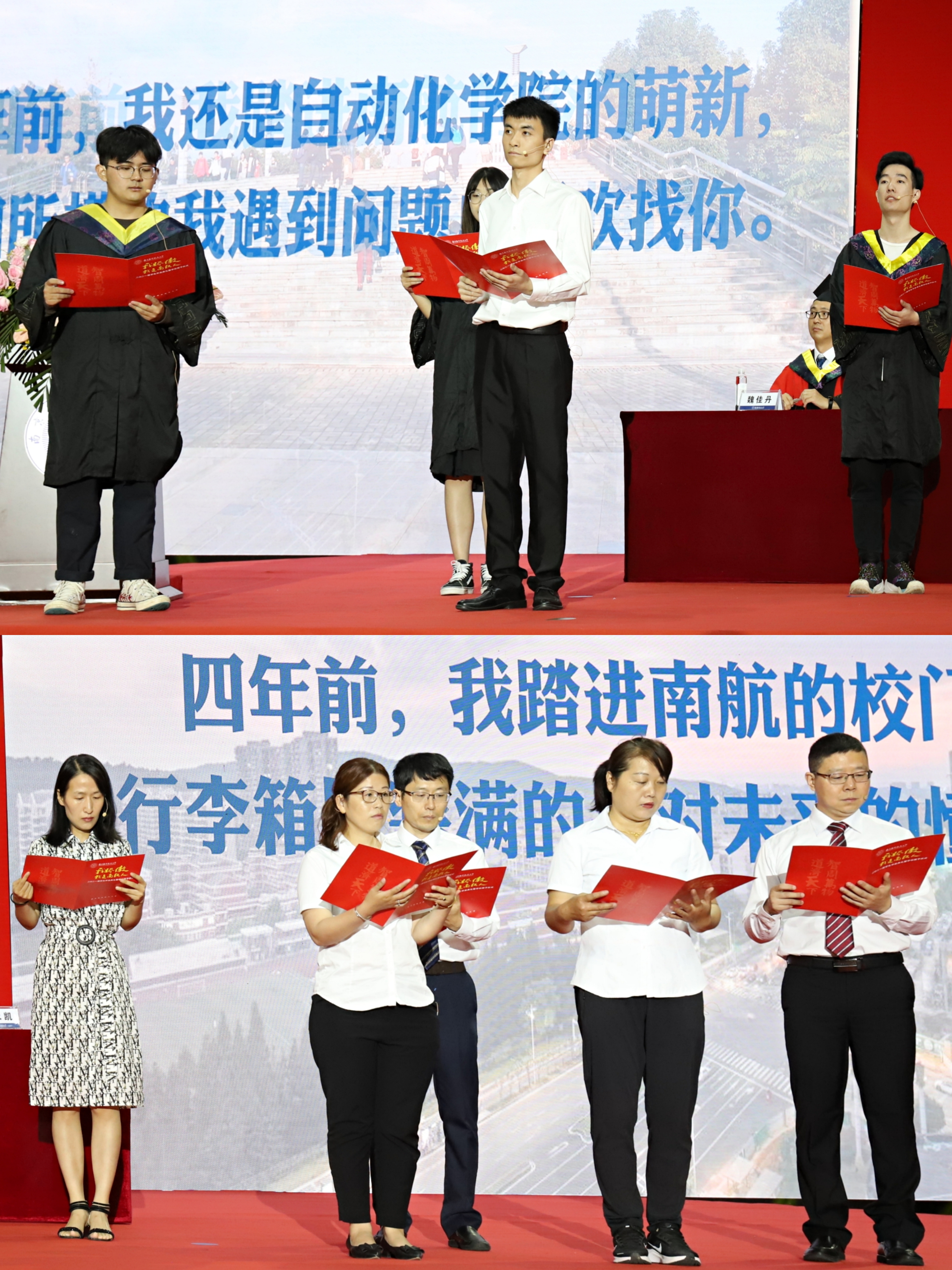 方天治老师代表AWC万象城娱乐全体教师为2021届同学们送上祝福,对毕业生们四年来的努力与成就给予肯定,鼓励大家带着全体教师的殷切期望和真诚祝福,勇敢踏上新的征程,方老师清唱一首《送别》祝福毕业生们前程似锦。自动化专业杨嵩林同学代表毕业生表达了对母校、老师和家长辛勤培育的感恩之情,愿所有毕业生保持善良与纯粹,不忘初心、矢志拼搏,立大志、做大事,永远选择希望,永远积极向上。教师代表、辅导员代表、宿管阿姨代表、学生代表为大家带来诗朗诵《你,再也不会问我》,回顾了永远难忘的师生情、同学情和四年青春年华。
