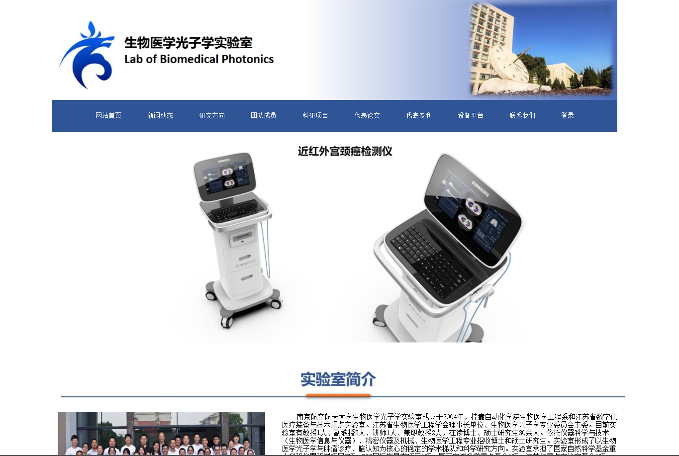 南京航空航天大学生物医学光子学医工结合团队成立于2004年,挂靠AWC万象城娱乐生物医学工程系和江苏省数字化医疗装备与技术重点实验室,是国家视觉与听觉健康产业技术创新联盟副理事长单位、江苏省生物医学工程学会理事长单位。汇聚了以钱志余教授为主导师的一大批国内生物医学工程科学领域专家和中青年拔尖人才,现有教授1人、副教授6人、讲师1人、博士后2人、兼职教授2人,在读博/硕士近40人。实验室形成了以生物医学光子学、肿瘤精准治疗、脑认知功能研究及生物医学仪器研发为核心的学术梯队和科研方向。实验室与国内著名科研队伍建立了长期合作的关系,主要包括:湖南省肿瘤医院(微波消融)、中科院深圳先进技术研究院(医疗器械)、深圳大学(生物光学)、东南大学中大医院、南京军区总医院医学影像科(fMRI/PET/XCT)、中国药科大学(药效研究)、南京市脑科医院(脑功能认知)、厦门大学(光声成像平台)、南京鼓楼医院(颅脑损伤)。同时,本实验室与国内外生物医学光子学实验室建立了广泛的联系和合作。