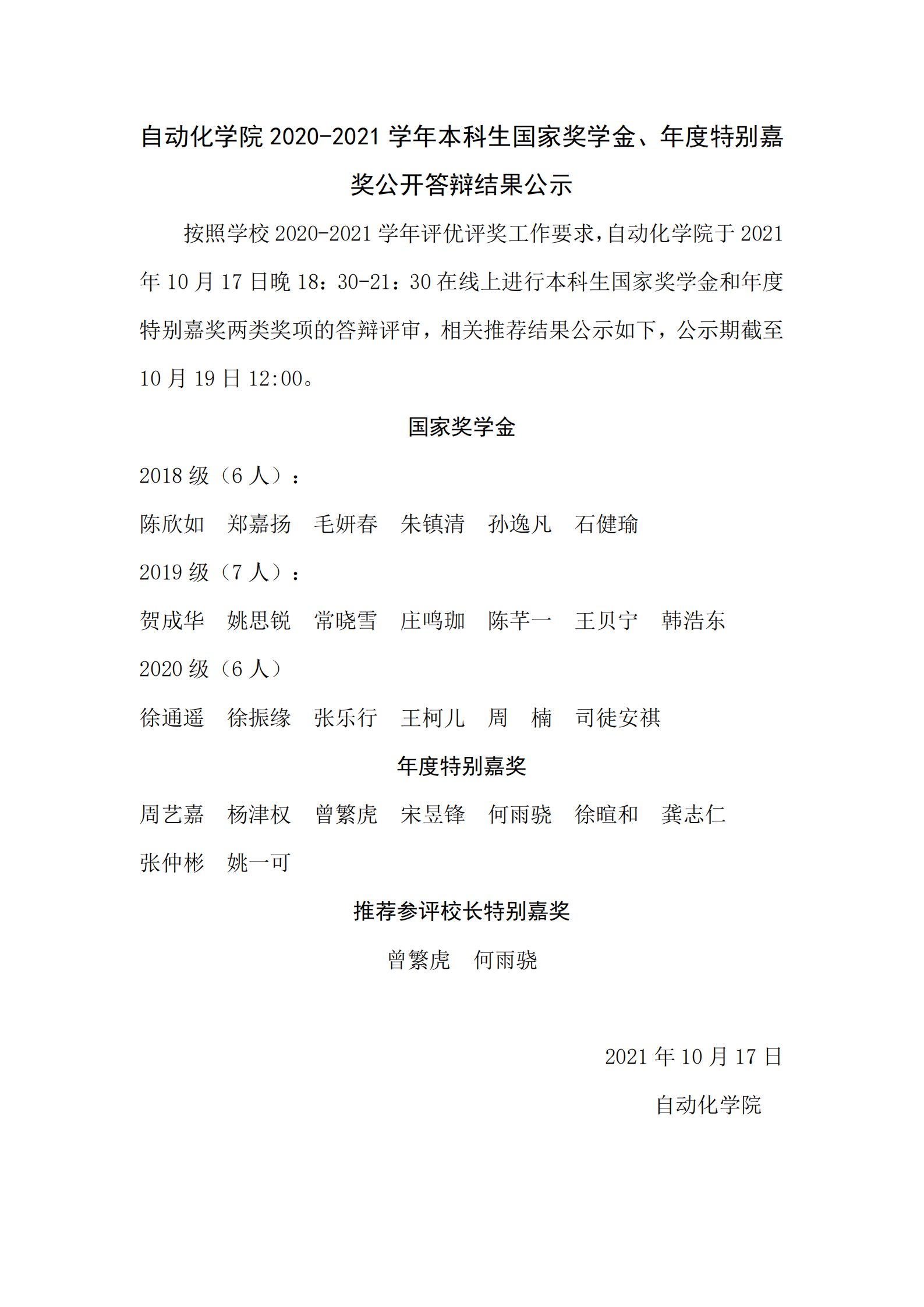 AWC万象城娱乐2020-2021学年本科生国家奖学金、年度特别嘉奖公开答辩结果公示