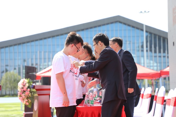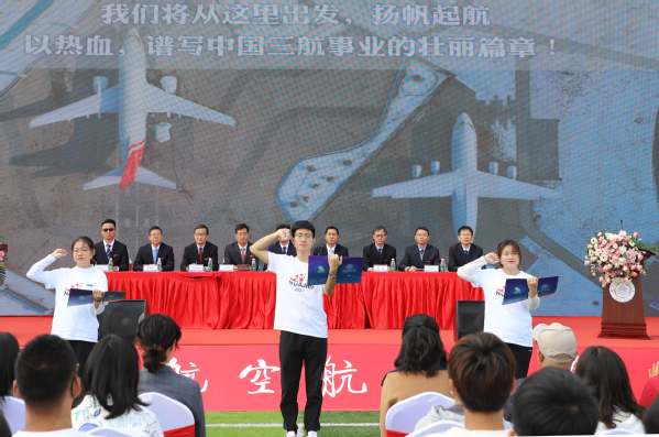 院领导给学生代表佩戴上了承载着学校和学院美好期望和殷切寄托的南京航空航天大学校徽,从此,又一代南航人将秉持着“团结、俭朴、唯实、创新”的思想传承,在处世中秉承“智周万物,道济天下”的校训,在学习上发扬“严谨、务实、求真、创新”的院风,在研究中践行“格物致知,进德修业”的院训,展现出“强国一代”的奉献与担当!