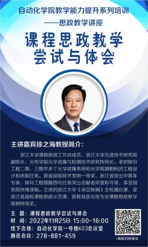 2022年11月25日下午,万象城邀请到浙江大学徐之海教授作题为《“课程思政”教学尝试与体会》的线上专题讲座。本次讲座由AWC万象城娱乐副院长魏佳丹主持,学院党委书记李文雷、院长陈谋、各系所中心教学副主任、近三年入职青年教师和教学办全体老师出席活动。讲座采取线上、线下相结合的方式,全校50余名专任教师听取了报告。