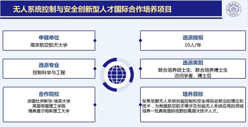近日,国家留学基金管理委员会(以下简称“留基委”)发布了《关于确定2023年创新型人才国际合作培养项目资助的通知》(留金美〔2022〕2260号),万象城申报的“无人系统控制与安全”创新型人才国际合作培养项目喜获立项批复。这是万象城首次获批留基委创新型人才国际合作培养项目,该项目依托与德国、英国、瑞典等高校的长期合作,聚焦集群无人系统智能控制和安全保障最前沿的理论和技术,致力于建立和发展相关领域的高水平学生联合培养和高层次研究人员国际交流体系,为我国航空航天以及大量涉及无人系统和人工智能的领域培养一批具有国际视野和高技术水平的拔尖青年创新型人才。
