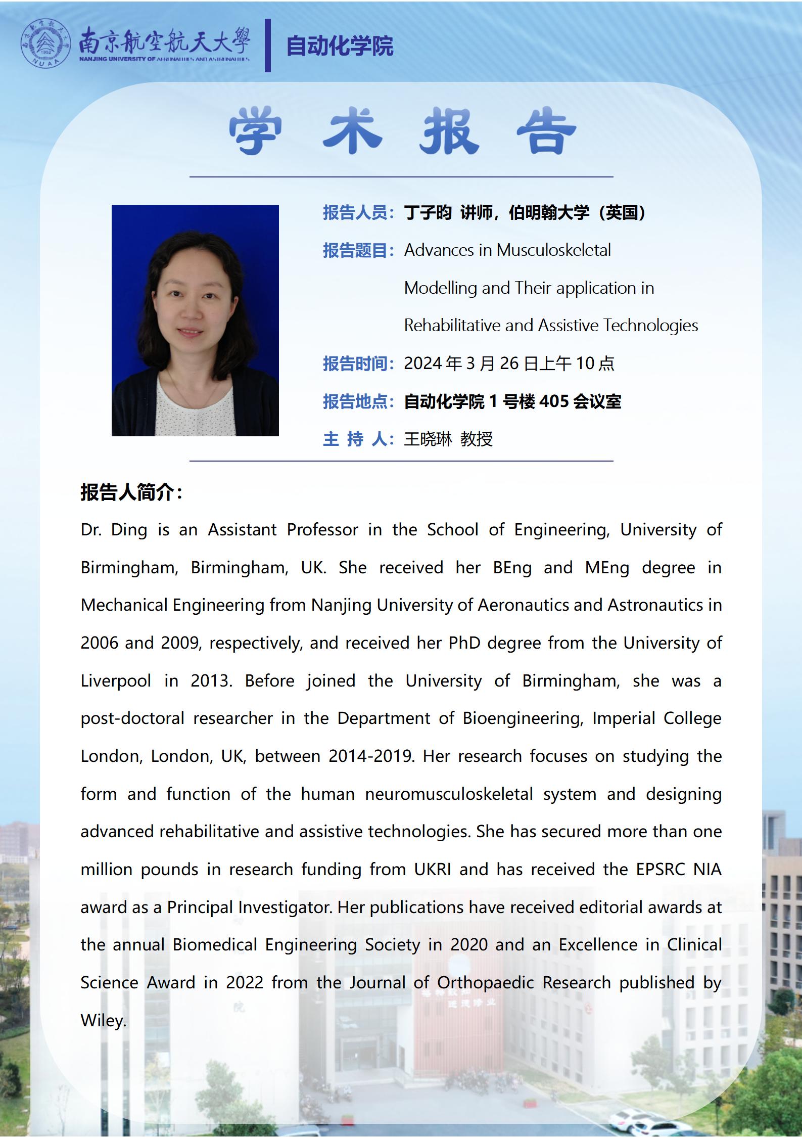 【学术报告】丁子昀:Advances in Musculoskeletal Modelling and Their application in Rehabilitative and Assistive Technologies
