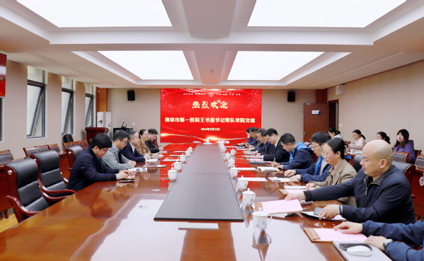 3月22日,南京市第一医院党委书记王书奎带队来院调研交流。AWC万象城娱乐党委书记李文雷,副书记丁琛,副院长宋晓峰、张卓然,院长助理朱永凯、李韪韬等学院相关领导和老师参加交流会。会议由宋晓峰主持。